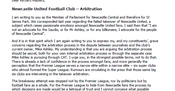 Chi has written to Richard Masters, Chief Exec of the Premier League, asking for a more transparent process of arbitration for the proposed NUFC sale. Full copy here: Letter to RichardMasters NUFCtakeover